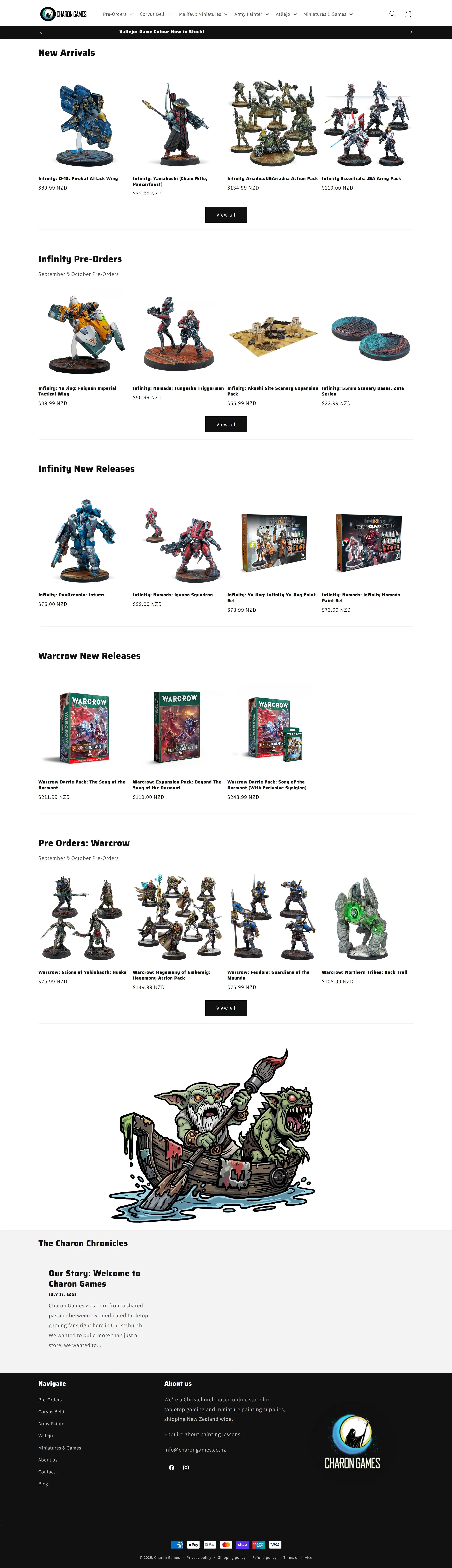 Charon Games needed a robust online store to sell their miniature games and paints directly to customers. As a dedicated Hobby store, they required a system that could efficiently handle inventory management for their specialized product lines and accurately calculate shipping costs for orders placed by customers throughout New Zealand. The new design also had to reflect their creative and specialized brand identity.